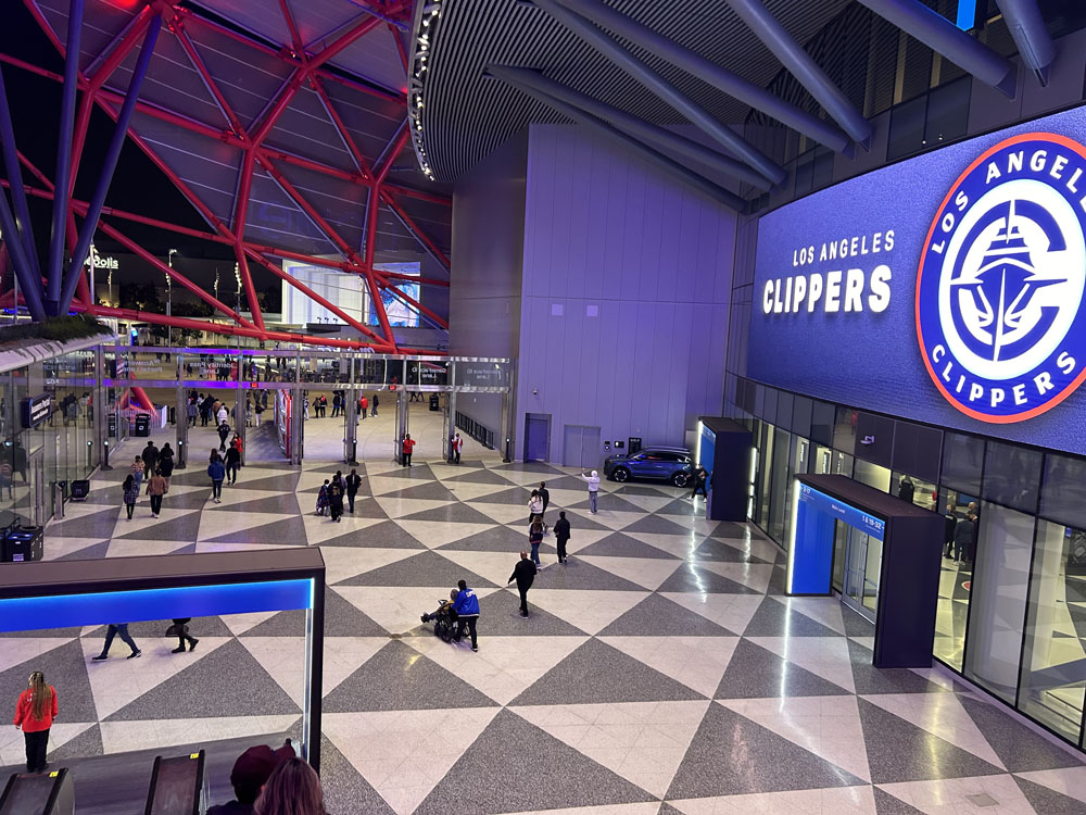 Up the tallest escalator west of the Rockies, we entered the top seating area, which had a perfect view of the court below due to the extreme vertical design of the place. Directly in front of us was a wraparound video screen and scoreboard that put most Imax screens to shame. Whenever a Clipper scored, his image appeared with a 3-D finger wag. Like most modern stadiums, the music and cheerleader appearances were way too loud, but it was impossible to miss any play on the court—which were instantly replayed on the wraparound.