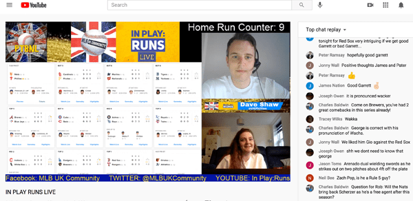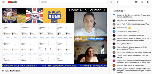 An encouraging thing that also happened last Sunday, though, is that I accidentally came across a fabulous YouTube channel called In Play: Runs, which is basically a gaggle of young Brit baseball fans doing “chat room” coverage of live Sunday MLB games from across the pond for over four hours! (Check out a few minutes of it here.) None of these people have been schooled in advanced metrics, and simply report and emotionally react to what their favorite teams are doing on the field. From watching a mere half hour of this weekly event, their enthusiasm for the game, knowledge of the players, and immersion in the actual drama is so evident, that I get more pure enjoyment out of it than five seconds of what is now passing for TV game coverage over here. All of the In Play: Runs “chatters” have Twitter accounts you can follow, but to hell with that. I want to meet these blokes!